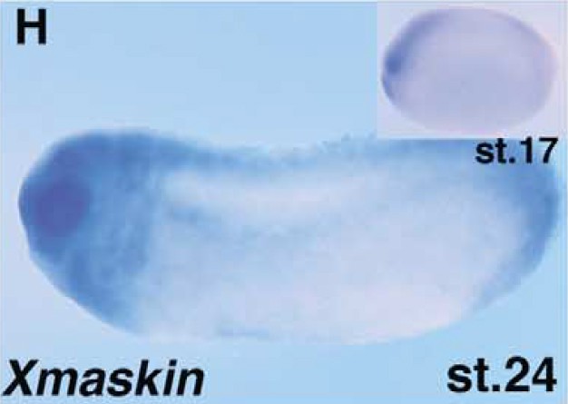 Larger Image tacc3 (transforming, acidic coiled-coil containing protein 3 ) gene expression in Xenopus laevis embryos, NF stage 24 (stage 17 inset), as assayed by in situ hybridization. Lateral view: anterior left, dorsal up. This image is extracted from figure published in: Tessmar K et al. (2002), Image published in: Tessmar K et al. (2002) Copyright © 2002. Image reproduced with permission of the Publisher, Elsevier B. V.