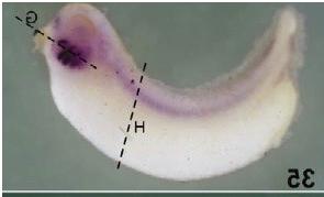 Larger Image uncx (unc homeobox ) gene expression in Xenopus laevis embryo, assayed via in situ hybridization, NF stage 35, lateral view, anterior left, dorsal up. Image published in: Sánchez RS and Sánchez SS (2013) Copyright © 2013. Image reproduced with permission of the Publisher.