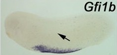 Larger Image gfi1b (growth factor independent 1B transcription repressor) gene expression in Xenopus laevis embryo, assayed via in situ hybridization, NF stage 26, lateral view, anterior left, dorsal up. The region of the dorsal lateral plate mesoderm is indicated by the arrow. This image is extracted from figure published in: Ciau-Uitz A et al. (2013), Image published in: Ciau-Uitz A et al. (2013) Copyright © 2013. Image reproduced with permission of the Publisher and the copyright holder. This is an Open Access article distributed under the terms of the Creative Commons Attribution License.