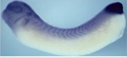 Larger Image tbx6 (T-box 6) gene expression in Xenopus laevis embryo, assayed via in situ hybridization, NF stage 28, lateral view, anterior left, dorsal up. This image is extracted from figure published in: Maguire RJ et al. (2012), Image published in: Maguire RJ et al. (2012) Copyright © 2012. Image reproduced with permission of the Publisher, Elsevier B. V.
