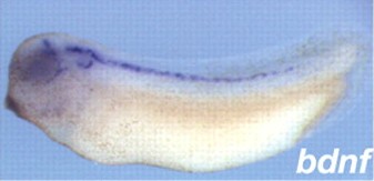 Larger Image bdnf (brain-derived neurotrophic factor ) gene expression in Xenopus laevis embryo, assayed via in situ hybridization, NF stage 32, lateral view, anterior left, dorsal up. Image published in: Panagiotaki N et al. (2010) Copyright © 2010. Image reproduced with permission of the Publisher and the copyright holder. This is an Open Access article distributed under the terms of the Creative Commons Attribution License.