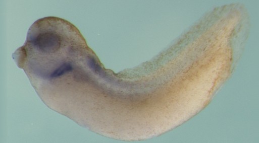 Larger Image rarb (retinoic acid receptor, beta) gene expression in Xenopus laevis embryos, NF stage 33 & 34, as assayed by in situ hybridization, lateral view, anterior left, dorsal up. This image is extracted from figure published in: Escriva H et al. (2006), Image published in: Escriva H et al. (2006) Copyright: © 2006 Escriva et al. Creative Commons Attribution license