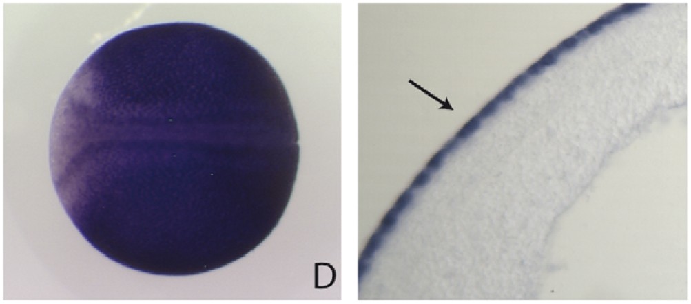 Larger Image upk3a (uroplakin 3A) gene expression in a Xenopus laevis embryo, NF stage 14, as assayed by in situ hybridization. Left panel, dorsal view, anterior left; right panel transverse section, dorsal up This image is extracted from figure published in: Chalmers AD et al. (2006), Image published in: Chalmers AD et al. (2006) Copyright © 2006. Image reproduced with permission of the Publisher, Elsevier B. V.