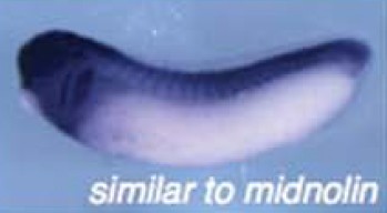 Larger Image midn (midnolin) gene expression in Xenopus laevis embryo, assayed via in situ hybridization,NF stage 30, lateral view, dorsal up, anterior left. This image is extracted from figure published in: Cuykendall TN and Houston DW (2010), Image published in: Cuykendall TN and Houston DW (2010) Copyright © 2010. Image reproduced with permission of the Publisher, John Wiley & Sons.