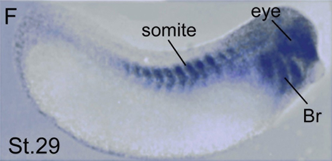Larger Image slc19a1 (solute carrier family 19 (folate transporter), member 1) gene expression in Xenopus laevis embryos, NF stage 29, as assayed by in situ hybridization, lateral view, anterior right, dorsal up. This image is extracted from figure published in: Li J et al. (2011), Image published in: Li J et al. (2011) Li et al. Creative Commons Attribution license