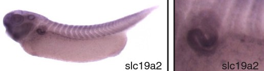 Larger Image UNNMED (Putative ortholog of thiamine transporter 1 (Solute carrier family 19 (Thiamine transporter), member 2) (High affinity thiamine transporter THTR-1) (High-affinity thiamin transporter), 1 of 1 (slc19a2) gene expression in Xenopus laevis embryo, assayed via in situ hybridization, NF stage 35 & 36, lateral view, anterior left, dorsal up. This image is extracted from figure published in: Raciti D et al. (2008), Image published in: Raciti D et al. (2008) Copyright © 2008 Raciti et al. Creative Commons Attribution license