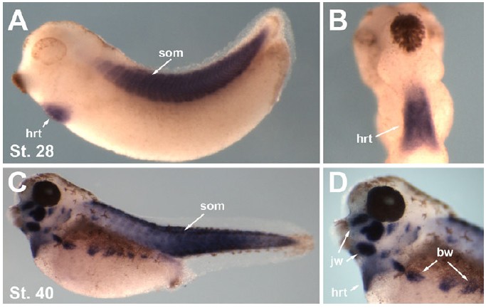 Larger Image Figure 2. Unc45b expression in Xenopus tropicalis. (A) WISH showing unc45b expression in developing heart (hrt) and somites (som) at stage 28. (B) ventral view of heart expression at stage 28. (C) unc45b expression at stage 40 throughout the somites and (D) in jaw (jw), heart (hrt) and body wall muscles (bw). Image published in: Geach TJ and Zimmerman LB (2010) Copyright ©2010 Geach and Zimmerman; licensee BioMed Central Ltd. Creative Commons Attribution license
