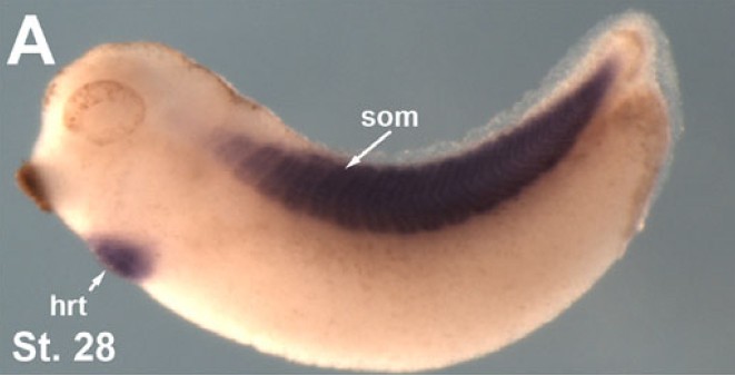 Larger Image unc45b (unc-45 homolog B) gene expression in Xenopus tropicalis embryo, assayed via in situ hybridization, NF stage 28, lateral view, anterior left, dorsal up. This image is extracted from figure published in: Geach TJ and Zimmerman LB (2010), Image published in: Geach TJ and Zimmerman LB (2010) Copyright ©2010 Geach and Zimmerman; licensee BioMed Central Ltd. Creative Commons Attribution license