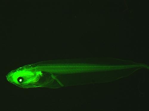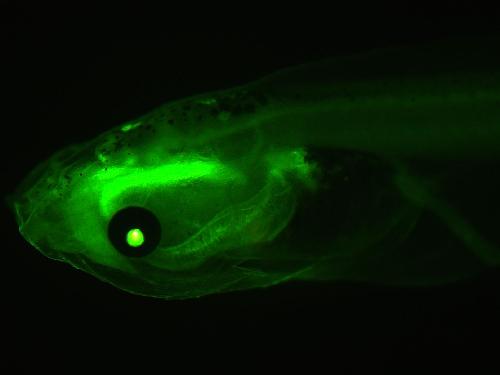GFP expression in late tadpole Xla.Tg(CMV:mGFP;cryga:mCherry)NXR , close up of head region.