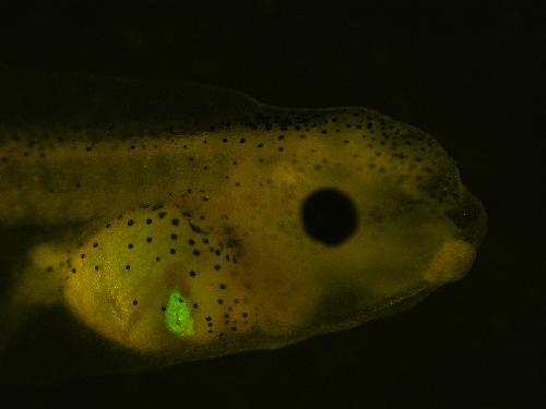 Xla.Tg(tubb2b:ChIEF;Rno.elas:GFP)NXR tadpole, showing clear GFP in pancreas.
