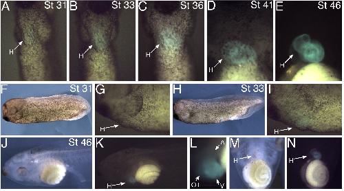 A-E: The onset of cardiac fluorescence in a MLC2::GFP embryo can be detected faintly at stage 31 and is then more easily observed during heart looping stages. A: Ventral view of the heart-forming region at stage 31, anterior is to the top. B: Stage 33. C: Stage 36. D: Stage 41. E: Stage 46. F-I: Left lateral views showing the early detection of GFP in the heart. F, G: Bright field view and detail view of fluorescence at stage 31. H, I: Comparable images at stage 33. J-N: The GFP emission is restricted solely to the heart myocardium and is absent from all skeletal and smooth muscle. Images taken at stage 46. J, K: Bright field and fluorescence images of a left lateral view of the tadpole head and trunk. L: Left lateral detail of heart fluorescence. M, N: Bright field and fluorescence images of the ventral trunk. All images presented are of the same transgenic animal. H, heart; OT, outflow tract; A, atria; V, ventricle.