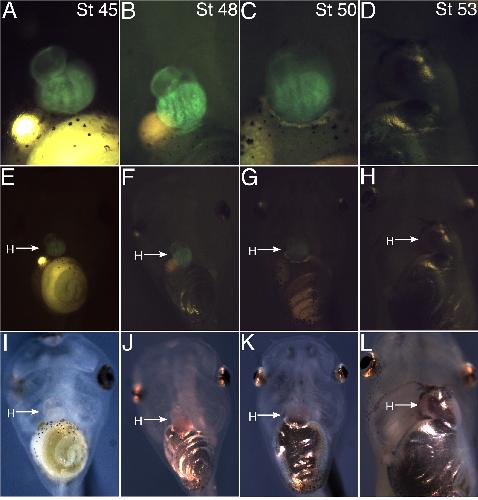 A-D: Detail ventral views of GFP fluorescence in the beating heart during larval stages. A: Stage 45. B: Stage 48. C: Stage 50. D: Stage 53. The GFP signal intensity increases in brightness to stage 48, but then Xanthophore pigment cells migrate over the pericardium to obscure the heart myocardium. The yellow sphere to the right posterior side of the heart is the gall bladder. E-H: Fluorescence images of the ventral head and trunk at the same stages. I-L: Bright field images of the ventral head and trunk. H, heart.