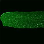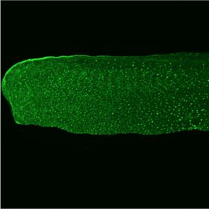 GFP expression in mitochondria in Xla.Tg(CMV:eGFP-OMP25) embryo, early tadpole stage, head and trunk regions, anterior left, dorsal up. Image from the MBL Embryology Course, 2017.