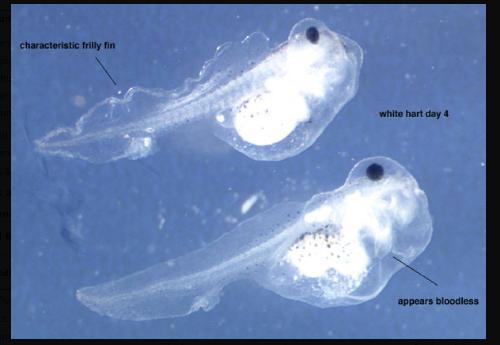 Xtr.smad4.1 mutant embryos. The white hart/wha phenotype includes no circulating blood cells, normal heartbeat, defect in blood formation, the dorsal fin appears 'frilly'.