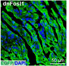 Description: Fosl1 protein was mutated and truncated to generate 3 mutant polypeptides which then cloned into pcDNA3.1 plasmid (pcDNA-Fosl1-NT, pcDNA-Fosl1∆DB, and pcDNA-Fosl1∆LZ ). Full length of Fos, FosB, and Fosl2 were amplified from X. tropicalis cDNA library and cloned into pcDNA3 plasmid to construct pcDNA-Fos, pcDNA-FosB, and pcDNA-Fosl2 plasmids. Fosl1-NT with the maximum capacity to inhibit Fosl1-driven luciferase activity was used as the dnFosl1 due to its safety for other Fos proteins The DNA fragment of dnFosl1 was then fused with a T2A-EGFP coding sequence and cloned into a I-SceI transgenesis vector downstream of the 3 kb mlc2 promoter to construct the transgenesis plasmid pMlc2-dnFosl1-T2A-EGFP. The transgenesis plasmid and I-Sce1 enzyme were then injected into the animal pole of X. tropicalis embryos at one-cell stage to generate a transgenic line. Founder X. tropicalis were identified and propagated to establish this stable line.
