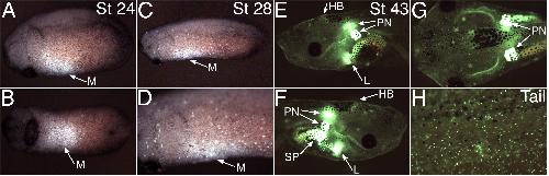 A-D: The onset of fluorescence from the LURP1::EGFP transgene reveals the differentiation and dispersal of embryonic macrophages from an anterior ventral domain of the tailbud stage embryo. A, B: Left-lateral and ventral views of a stage 24 embryo. C, D: Left-lateral and a detail view of a stage 28 embryo. E-H: The widespread distribution of macrophages and the locations of myeloid cell production in growing larvae. E, F: Left and right-lateral views of a stage 43 tadpole showing bright EGFP fluorescence in the major haematopoietic organs, the liver, pronephros and spleen. Additionally, hundreds of punctate, peripherally located macrophages are detected throughout all tissues of this transgenic animal. G: Dorsal view of the same tadpole. H: Detail view showing the concentration of macrophages within the tail. In this transgenic line, the LURP1 promoter also produces expression within a region of the tadpole hindbrain (E-G). M, myeloid domain of embryonic macrophage differentiation; L, liver; PN, pronephros; SP, spleen; HB, hindbrain.