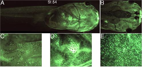 A, B: Right ventral-lateral and dorsal-lateral views showing the bright EGFP signal of a stage 54 larva. C-E: Views of the right hindlimb (C), right trunk (D) and a detail view of the trunk (E), with punctate fluorescence denoting tissue-resident macrophages. At this late stage of development, fainter fluorescence is also found in a lattice-like pattern in the epidermis, which perhaps results from the gradual accumulation of stable green fluorescent protein from macrophages to extracellular compartments of the skin.