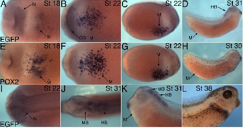 A-D: A series of transgenic embryos reveals that EGFP RNA can be detected within the anterior ventral, myeloid domain as early as stage 18. A: Ventral view of the anterior portion of a stage 18 embryo. B, C: Anterior ventral portion and right lateral view of a stage 22 embryo. D: Right lateral view of a stage 31 tadpole. EGFP RNA expression is detected in embryonic macrophages and also the brain, which is consistent with the fluorescence signals observed in this transgenic line. E-H: Sibling transgenic embryos after in situ RNA hybridization for the myeloid peroxidase POX2, which is the earliest and strongest marker of the dispersing embryonic macrophages. E: Anterior ventral portion of a stage 18 embryo. F, G: Anterior ventral portion and right lateral view of a stage 22 embryo. H: Right lateral view of a stage 30 embryo. I-L: The neural pattern of EGFP expression becomes increasingly restricted as development proceeds. I: Dorsal view of the head of the stage 22 embryo with diffuse transgene expression in the brain. J, K: Dorsal and left lateral views of the head of the stage 31 tadpole show that EGFP-expressing cells are becoming restricted to four compartments along the anterior-posterior axis of the developing brain. L: At stage 38, a right lateral view of the head shows EGFP expression in one compartment only, close to the mid/hindbrain boundary. This tadpole has visible pigment cells while the other tadpoles presented were treated to inhibit melanocyte pigment formation. M, embryonic macrophage; N, neural tissue; CG, cement gland; HB, hindbrain; MB, midbrain.