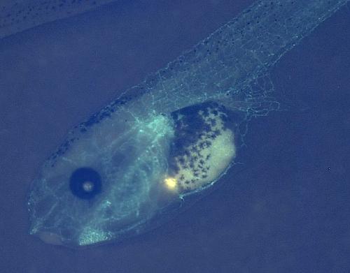 Endothelial lining of vasculature fluoresces blue-green in Xla.Tg(kdr:GFP)Mead tadpoles, especially bright in heart.