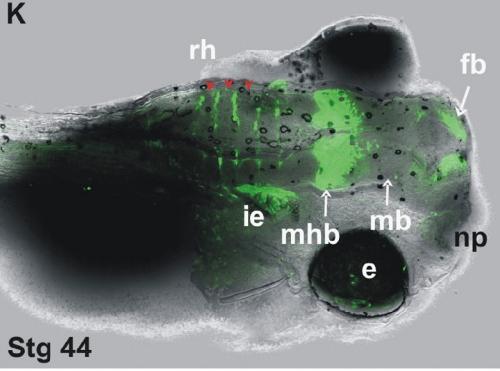 a dorsolateral view of head and spinal cord of a NF stage 45 embryo: e, eye; fb, forebrain; i.e., inner ear; mb, midbrain; mhb, midbrain-hindbrain boundary; np, nasal pit; ov, otic vesicles; rh, rhombomeres.