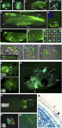 Figure S2: Expression of the d2EGFP protein (A-O) in transgenic embryos carrying the Wnt/β-catenin reporter construct. (A) Dorsal view of a stage-11 gastrulating embryo when GFP signals first become visible. (B-E) Dynamic and diversified expression of GFP signal in reporter embryos as development proceeds. Particularly strong expression was observed in the developing neural folds (nf) (B), and in the posterior presomitic mesoderm (psm), the migrating cranial neural crest (nc), and the olfactory epithelium (oe) (C-E). GFP is expressed in the DLP mesoderm and the VBI, from which definitive and primitive blood cells arise, respectively (C,E). (F) Transverse section of a stage-32 embryo (dashed line in E) shows high levels of Wnt activity in the VBI (indicated by meso, mesoderm) and also in the overlying ectoderm (ect). The inset shows DAPI staining of the section. (G) Stage-37 embryos show GFP-expressing blood cells leaving the VBI through the vittelline veins and circulating in the posterior cardinal vein (arrowhead) and throughout the whole body. (G’) A closer view of a selected area (G; dashed rectangle) shows GFP-positive blood cells (arrowheads) circulating in the vittelline veins. (H) GFP-expressing and DAPI-stained individual erythrocytes collected from stage-37 embryos and viewed by confocal microscopy. (I-K) Confocal images of transverse sections of an early tadpole. In the inset in panel I, dashed line 1 refers to panels I and J; dashed line 2 refers to panel K. There is strong expression of GFP in the peripheral retina (cmz, I) and in the differentiating lens fibers (lf in I). Wnt activity was also detected in the lung buds (lb in K), pronephric tubules (pt in K), and the dorsal part of the midbrain- hindbrain boundary (mhb in J). (L-N) Views of a late tadpole stage: dorsal (L), ventral (M) and lateral (N). GFP is continuously observed in the developing liver (lv in L), pronephric tubules (pt in N), and the brain (M,N). Note that GFP is expressed at the boundaries between the rhombomeres of the hindbrain (arrowheads in N). (O-Q) GFP expression is visible in various organs about the time of metamorphosis, especially in the mesencephalon (mesc in O), the pancreas (pc in P), and the growth plates of the developing limbs and digits (arrowhead in Q). Insets correspond to bright field images. (R) Detection of Wnt/β-catenin signaling in an E8.5 embryo of the BAT-Gal Wnt-reporter mouse. Strong β-galactosidase activity is visible in the embryo proper (lower left half) and in the extraembryonic mesoderm that forms the blood islands in the yolk sac (arrowhead). No activity is seen in the surrounding visceral endoderm (arrow).