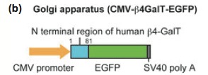| Description: | CMV-hBeta4GalT-EGFP, consists of a cytomegalovirus (CMV) promoter, the N terminal 81 amino acids of human (Hsa) Beta1, 4-galactosyltransferase (betaGalT1), and EGFP in pCS2p+ . |